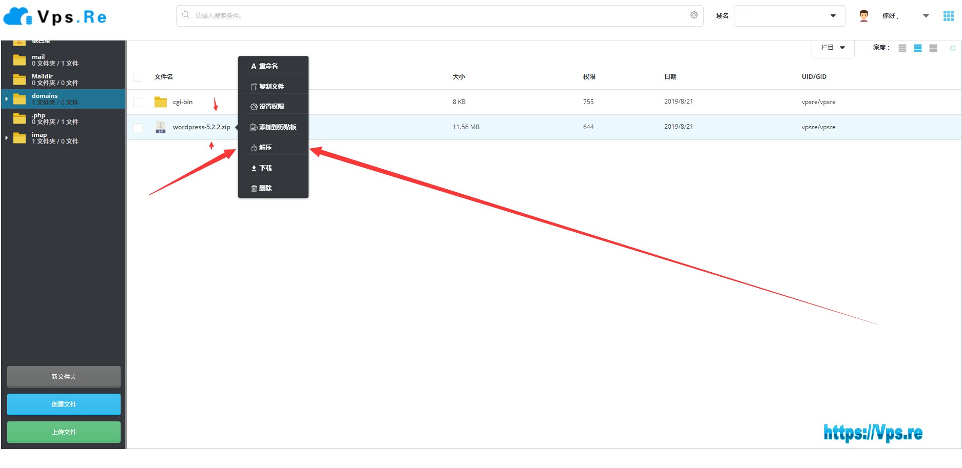 7.点击VPS.RE云控制台的上传文件,我们来上传程序到正确的网站目录里面